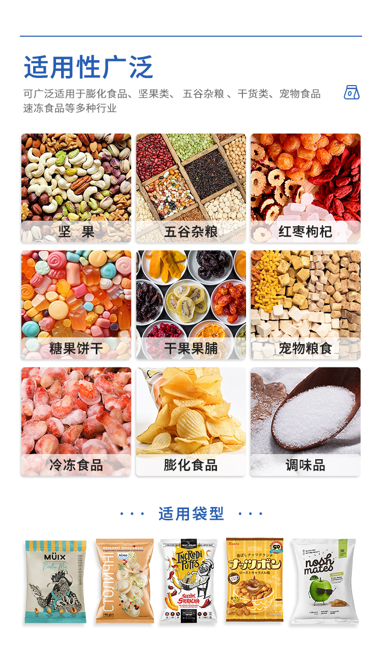 为满足不同领域客户的包装需求,公司已研发生产枕式包装机、颗粒立式机、粉剂立式机、液体立式机、给袋式包装机和罐装线等自动化设备,适用于农副产品、膨化休闲食品、冷冻食品、日用品、五金制品和医疗制品等各个行业。